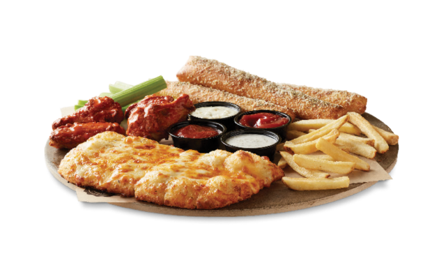 A little bit of this, a little bit of that! Our sides sampler offers a taste of three party favourites: cheesy bread, french fries, saucy meatballs, mozzarella sticks and your choice of traditional bone-in or boneless wings.